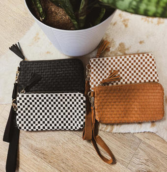 Bolso de mano tejido a cuadros al por mayor, Cartera de cuero vegano a la moda para tarjetas de crédito para mujer, bolso de mano a cuadros